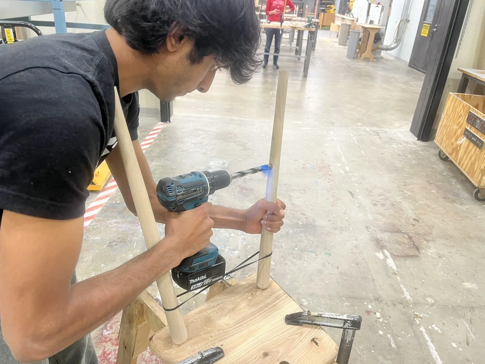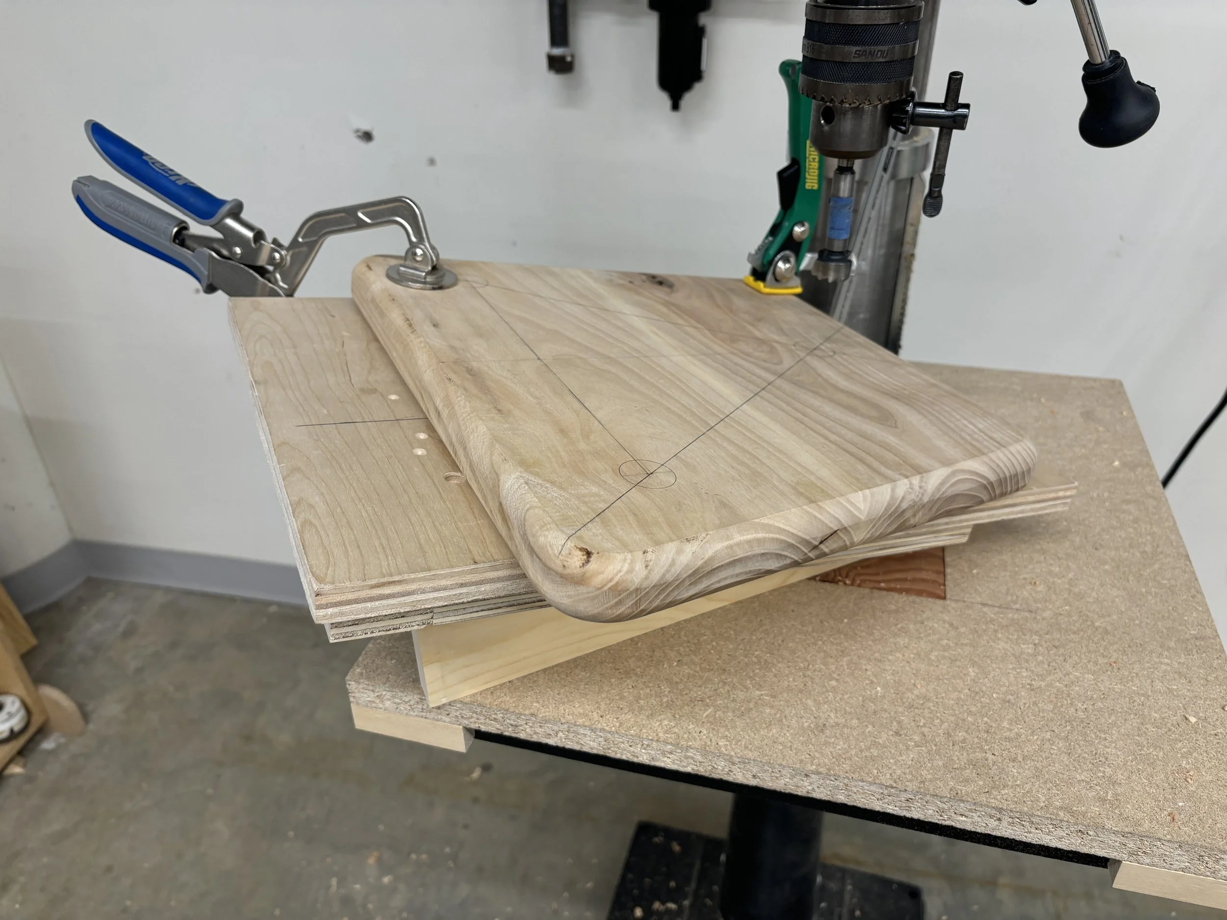 Drilling holes at calculated angles in seat and legs.